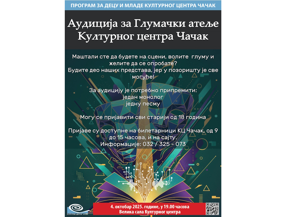 АУДИЦИЈА ЗА ГЛУМАЧКИ АТЕЉЕ КУЛТУРНОГ ЦЕНТРА ЧАЧАК – ПОЗОРИШНЕ РАДИОНИЦЕ ЗА ОДРАСЛЕ биће одржана 30.септембра 2023. у 16 часова у Великој сали Културног центра Чачак…