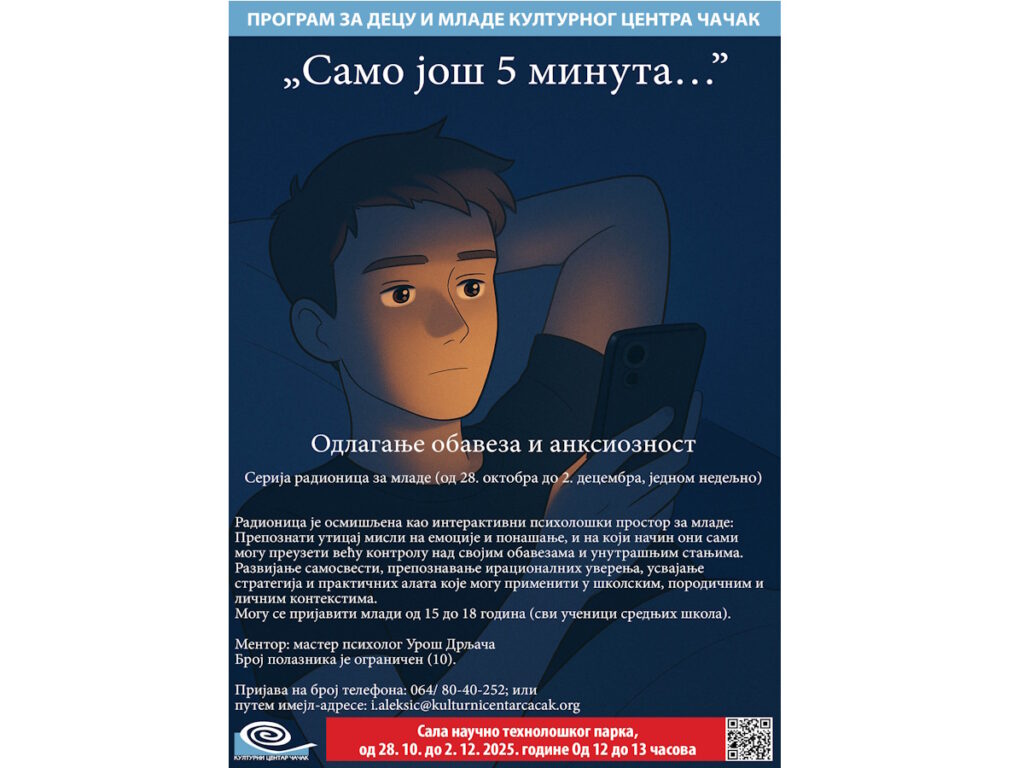 Odlaganje obaveza i anksioznostSerija radionica za mlade (od 28. oktobra do 2. decembra, jednom nedeljno, svakog radnog utorka – 4, 18, 25. novembra i 2. decembra)Radionica je osmišljena kao interaktivni […]